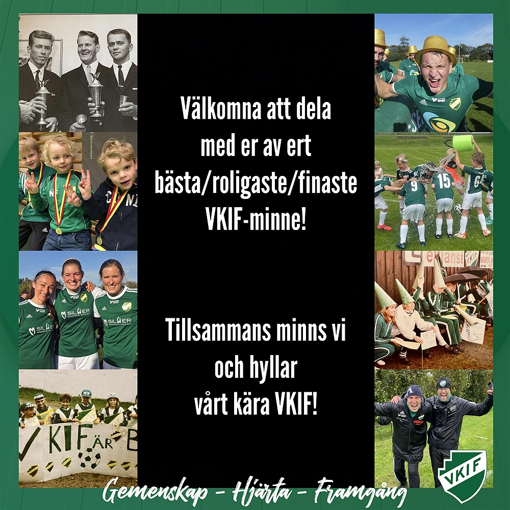 Som ni vet firar VKIF 90 år i år och klubben såg alltså dagens ljus redan 1935. Väldigt mkt har hänt sedan dess och nu vill vi ge er alla möjlighet att minnas tillbaka på just Er tid i vår gröna klubb. Vi arbetar just nu med en jubileumsskrift och vi vill gärna ha er hjälp med att fylla några av sidorna med era minnen från VKIF. Så tänk er tillbaka, alla har vi säkert ngt speciellt minne vi gärna tänker på, det spelar ingen roll om vi är nya eller gamla i klubben, yngre eller äldre, är eller har varit spelare, ledare, föräldrar, supportrar, eldsjälar, stödmedlemmar, loppispersonal eller kanske lite av varje, alla har vi nog något vi tänker på när vi minns oss tillbaka.